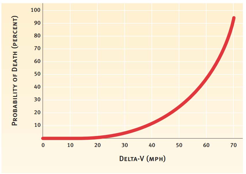 የ 70 ማይል በሰአት ያለው ተጽዕኖ ፍጥነት ወደ 100% የሚጠጋ ሞት እንዳለው ግራፍ ላይ አስተውል። ያ ሹፌር በ 70 ማይል በሰአት ላይ ዛፍ ሲመታ ወይም በ 35 ማይል በሰአት የሚጓዙ እና በግንባር ቀደም የሚጋጩ ሁለት አሽከርካሪዎች ሊሆኑ ይችላሉ።